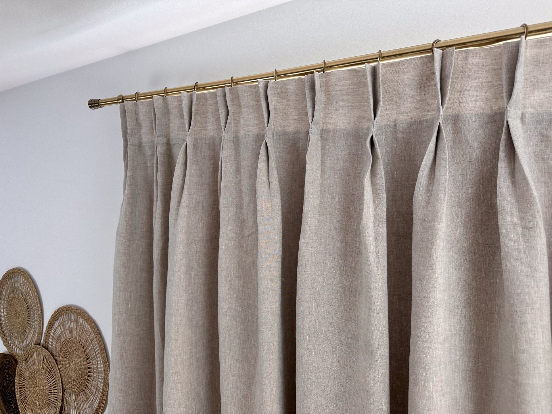 Linen drapery with double pinch pleat fits modern interiors and looks especially gorgeous with floor-length curtains. Each pleat is made by hand, and the curtain is X2 times full.